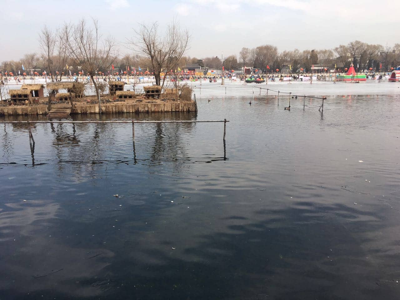 在北京最寒冷的滴水成冰季節(jié),多臺河湖潛水?dāng)_冰設(shè)備在野鴨島運(yùn)行,形成近千平米不凍冰的水域,即有野鴨戲水,也可冰場溜冰,同時引來游人的好奇觀瞻。