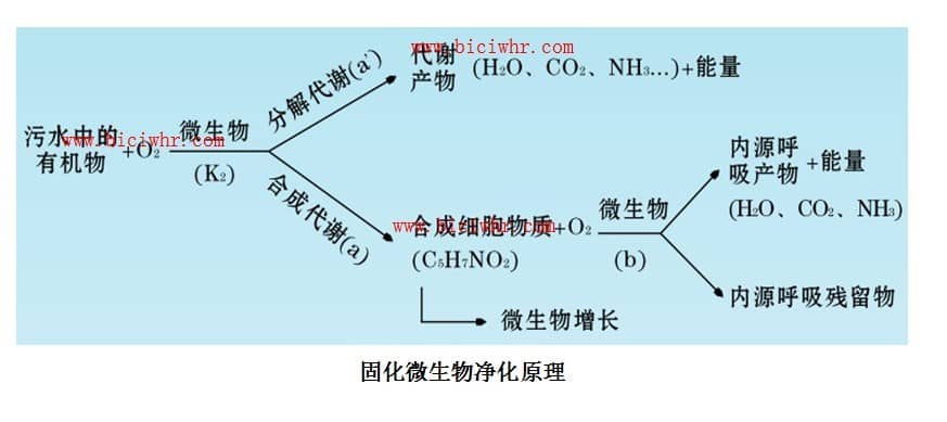 微生物和藻類有著相同的食源,而固化微生物在搶食能力方面強于藻類,所以藻類因得不到食物而死亡,死掉的藻類將被微生物消化掉。